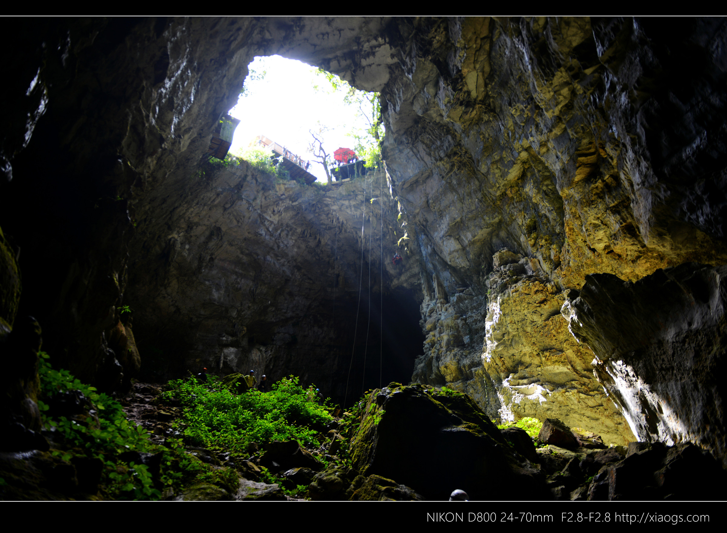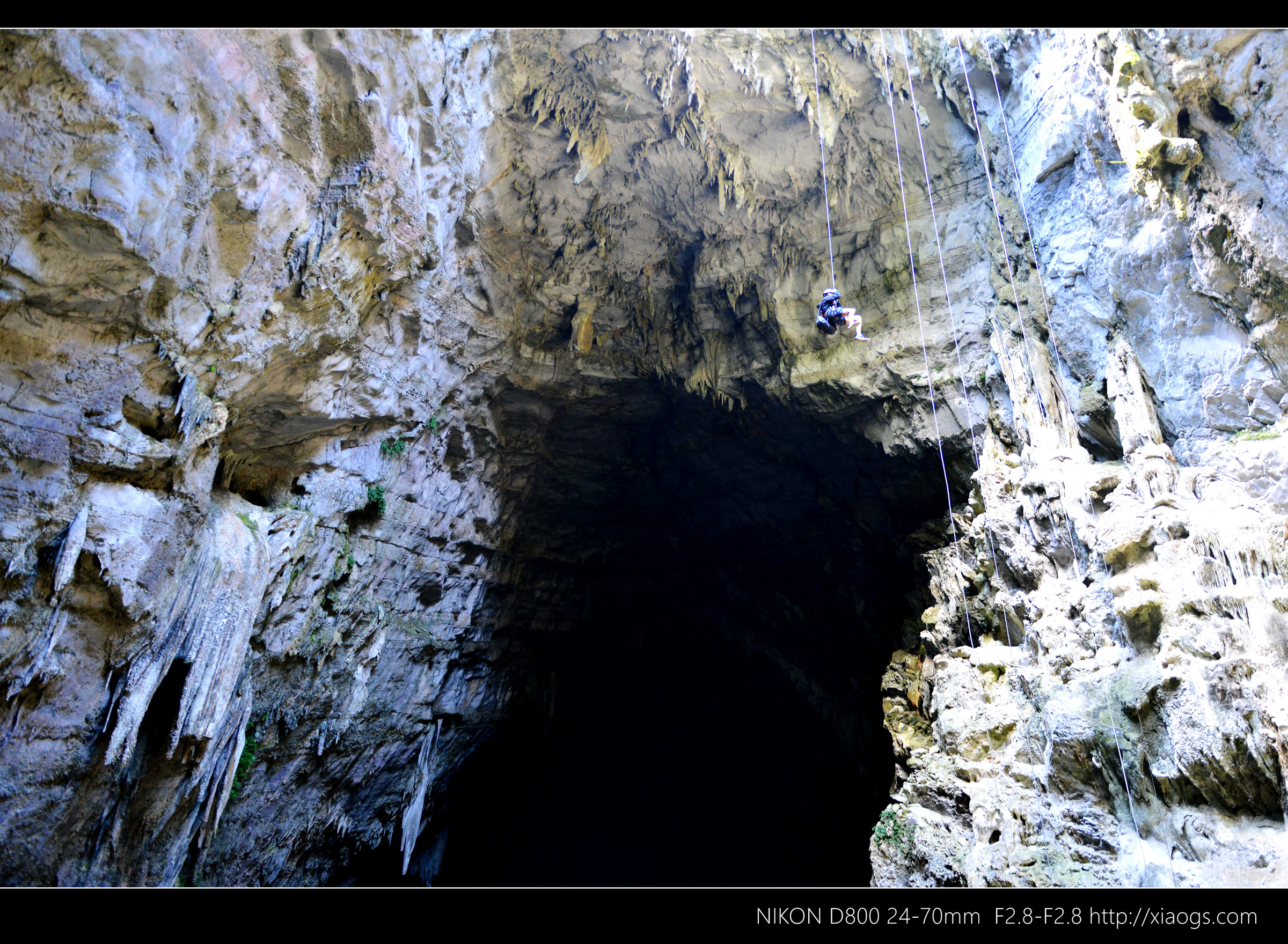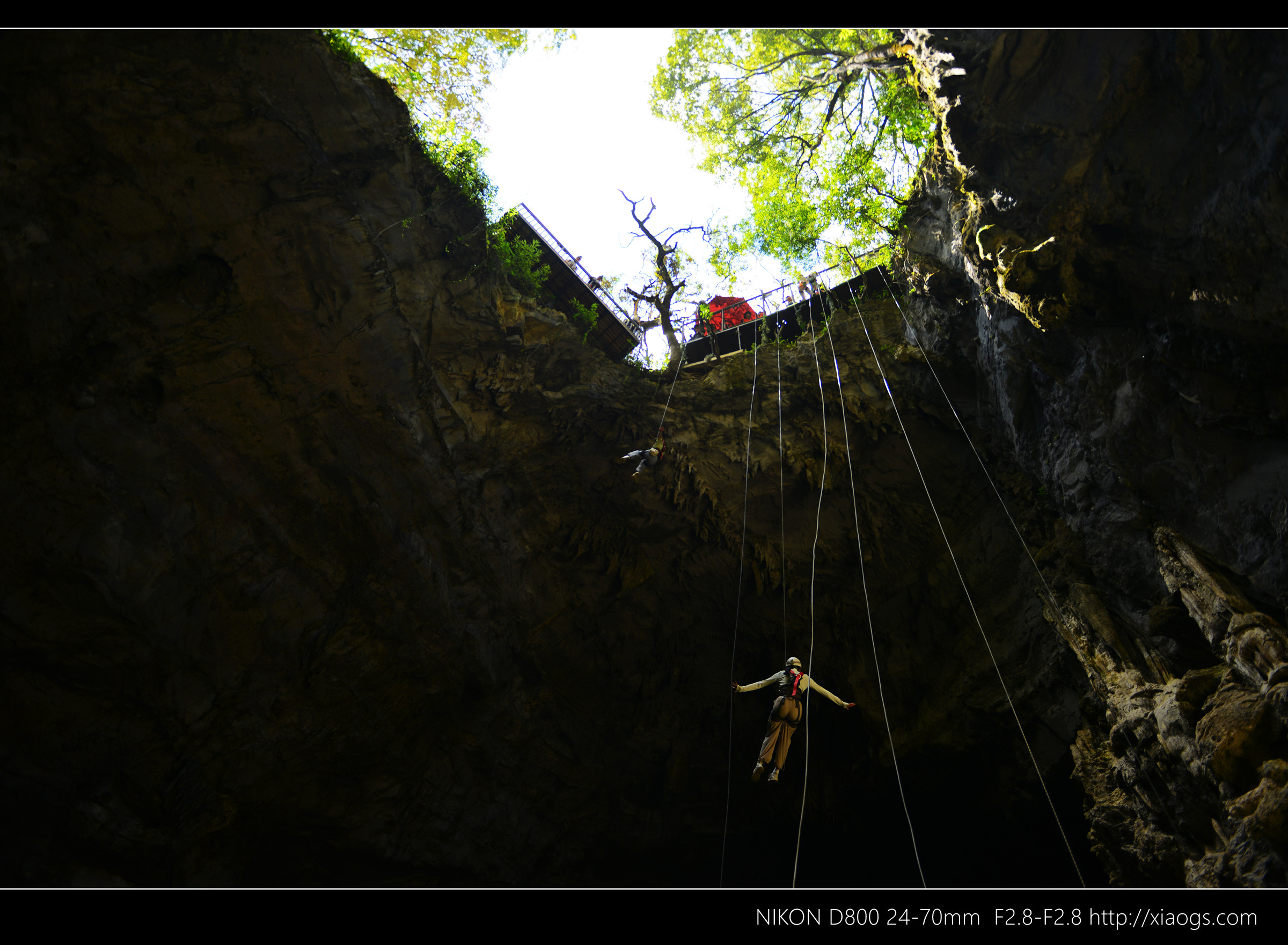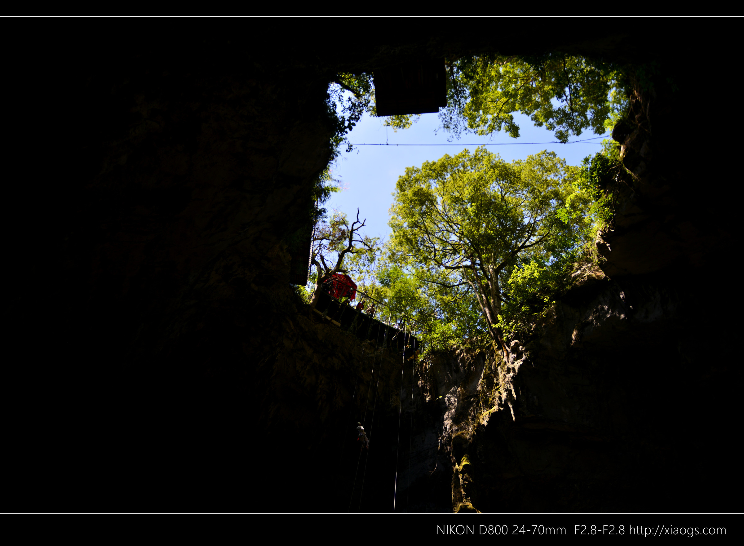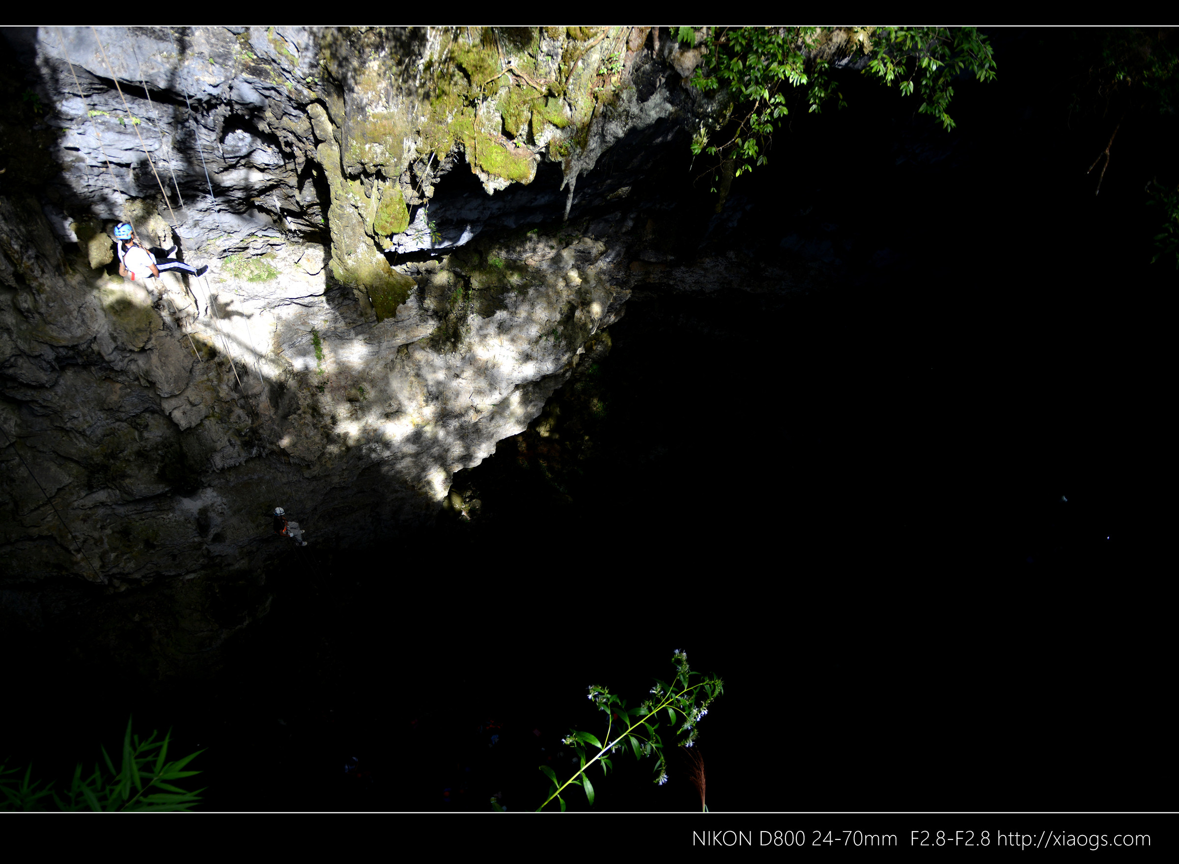 从上往下看风子荡天坑,左侧是正在速降的人。