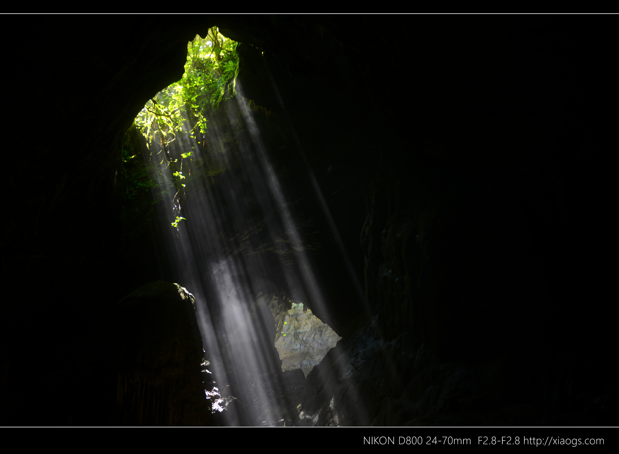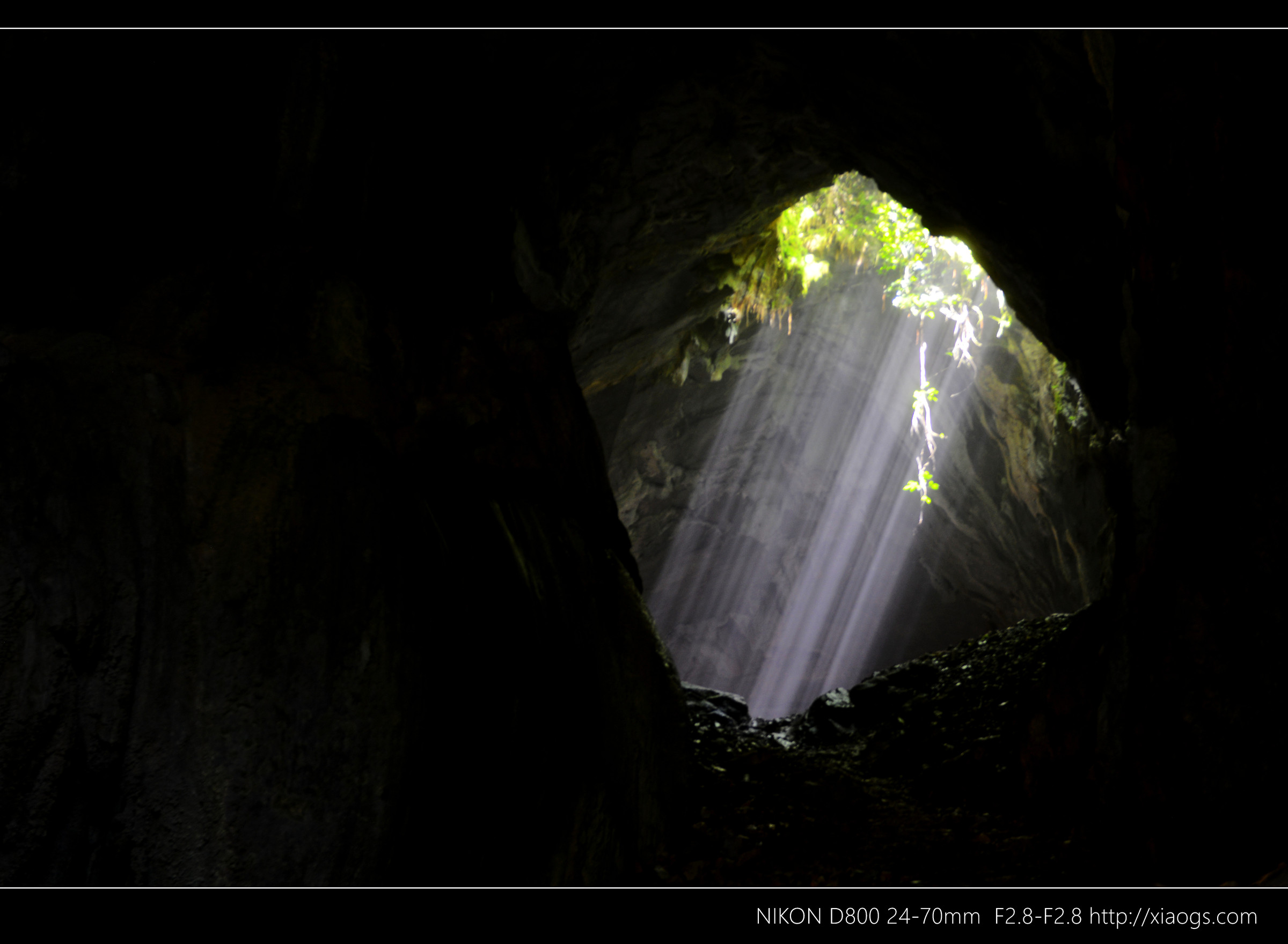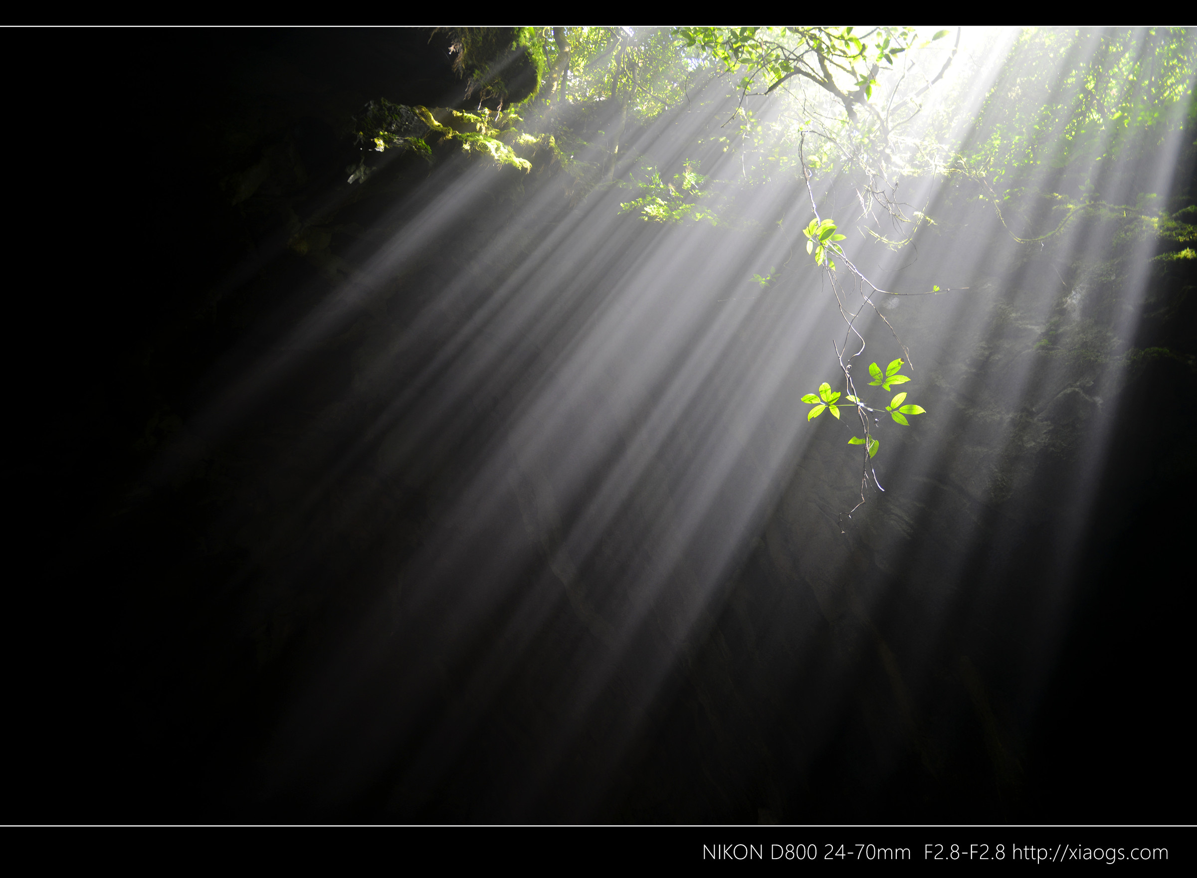 丁达尔效应的前提有三个,一是相对集中的光束,二是空气中足够量肉眼不可见的小颗粒,三是黑暗的背景。而这些,在上午十一点左右的光线角度,加上天坑内部的水汽、尘埃升起,刚好满足。我们运气属实不错。