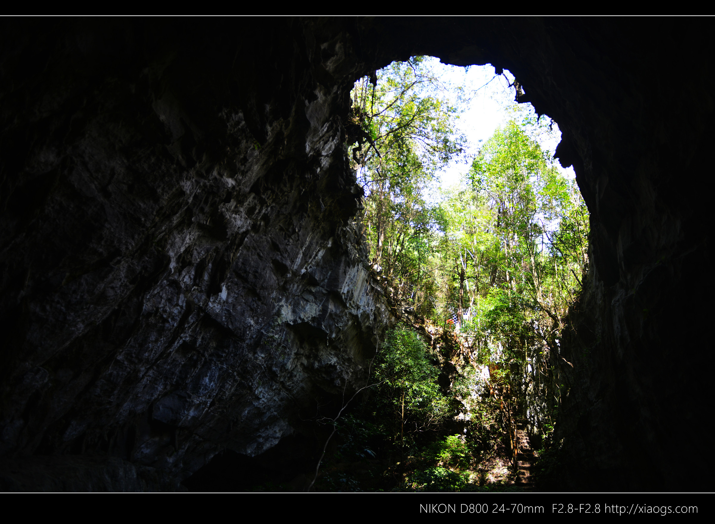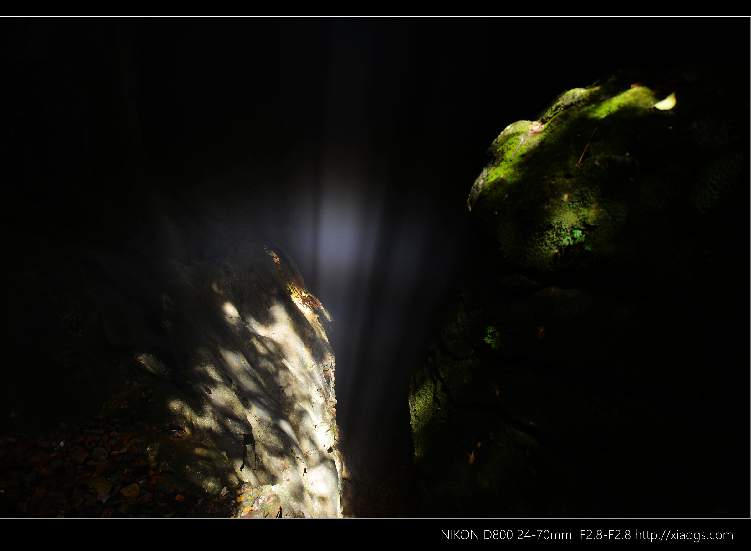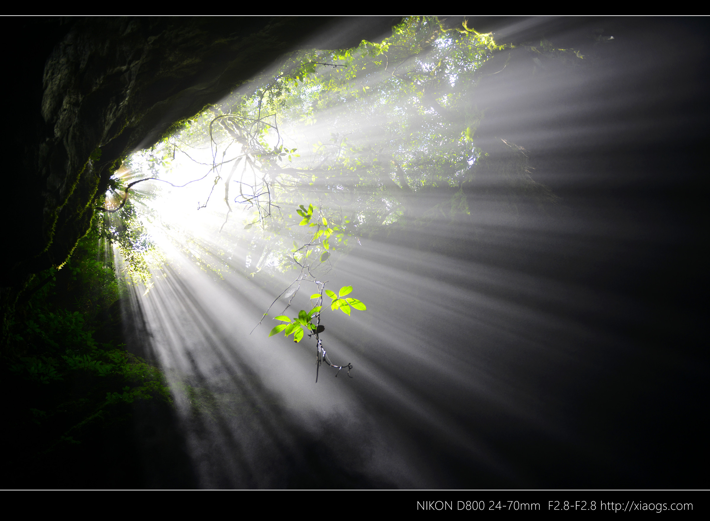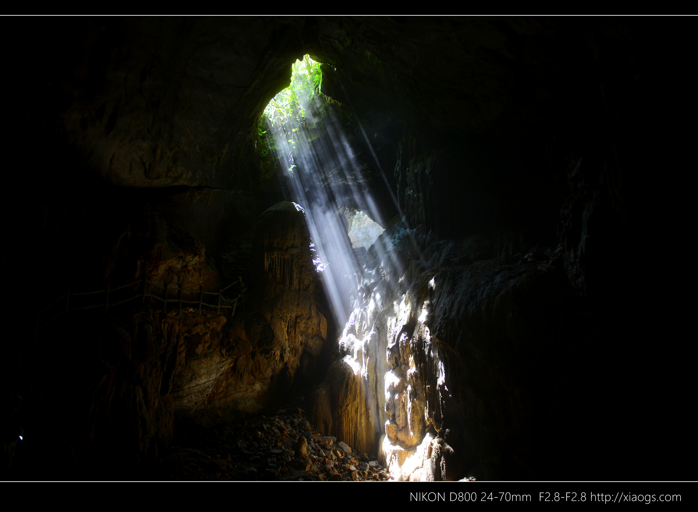 丁达尔效应的前提有三个,一是相对集中的光束,二是空气中足够量肉眼不可见的小颗粒,三是黑暗的背景。而这些,在上午十一点左右的光线角度,加上天坑内部的水汽、尘埃升起,刚好满足。我们运气属实不错。