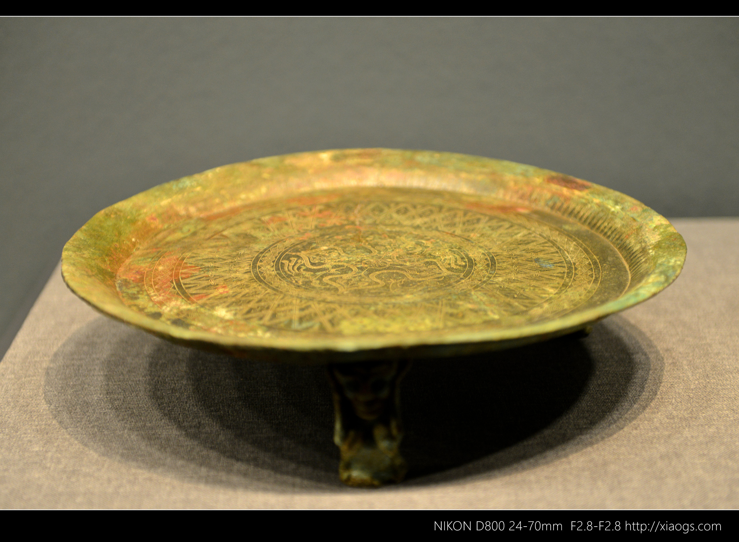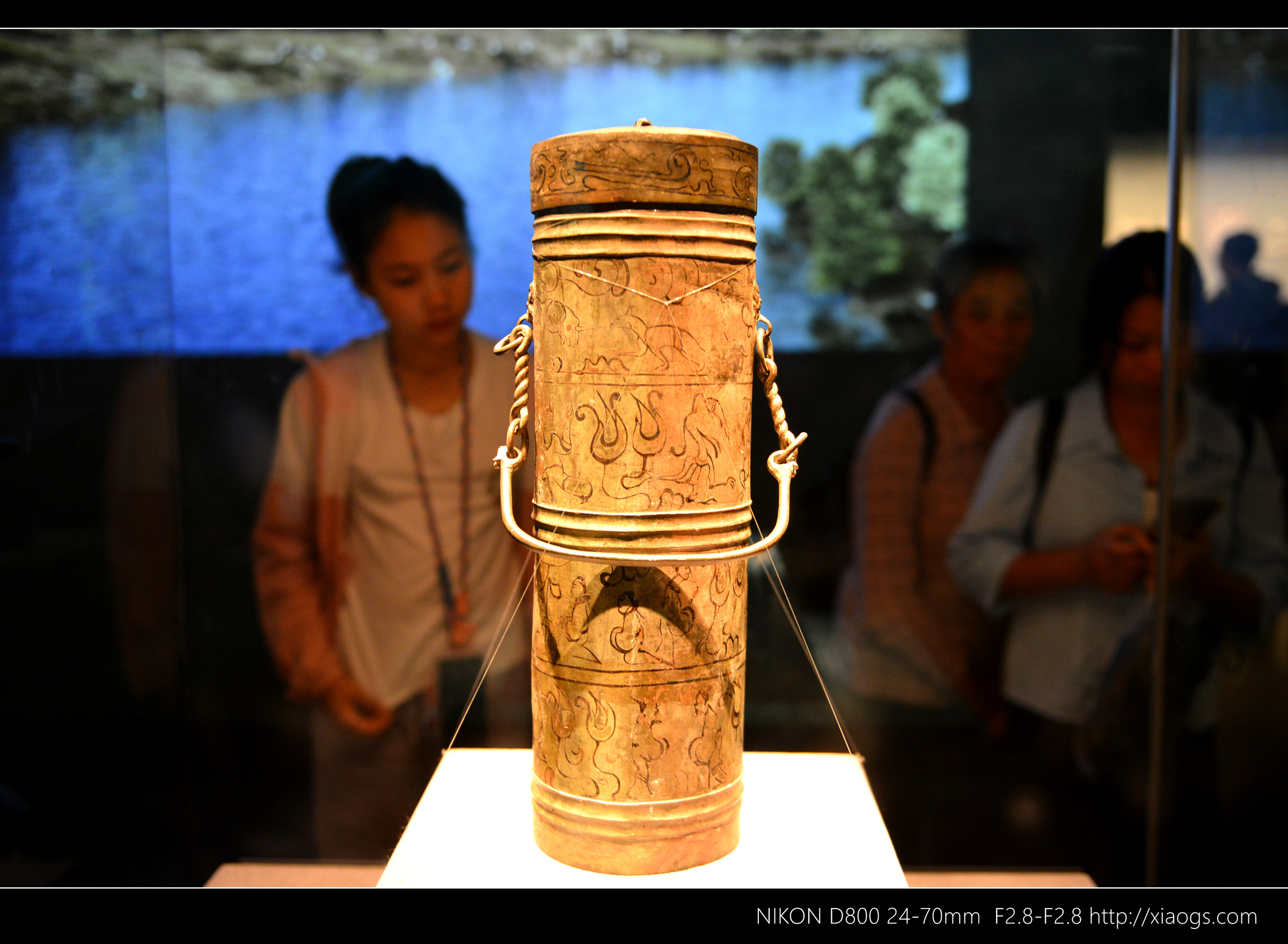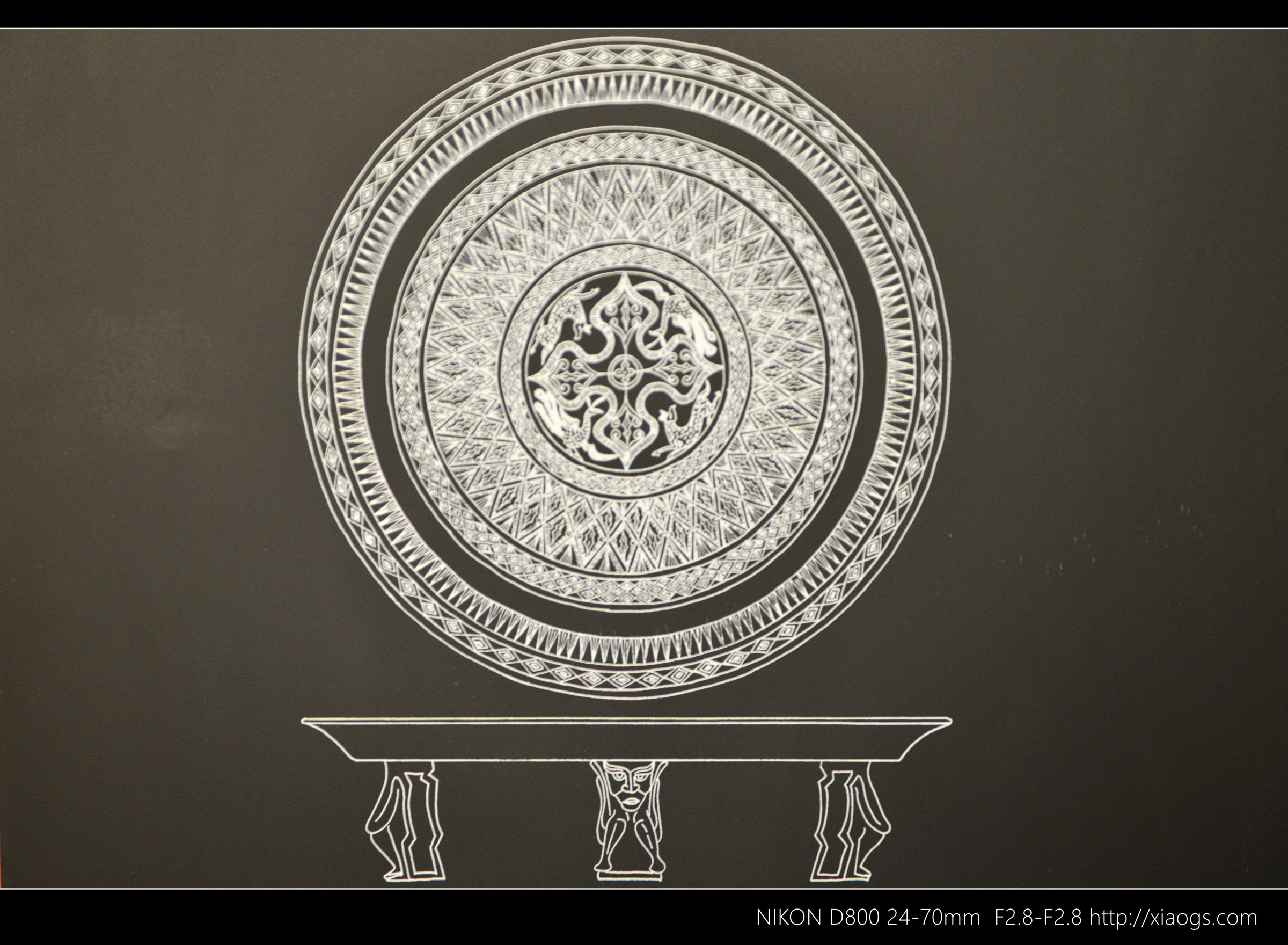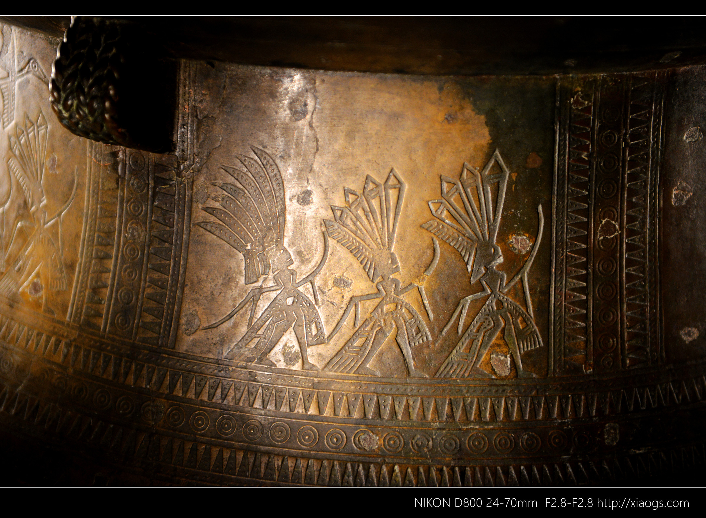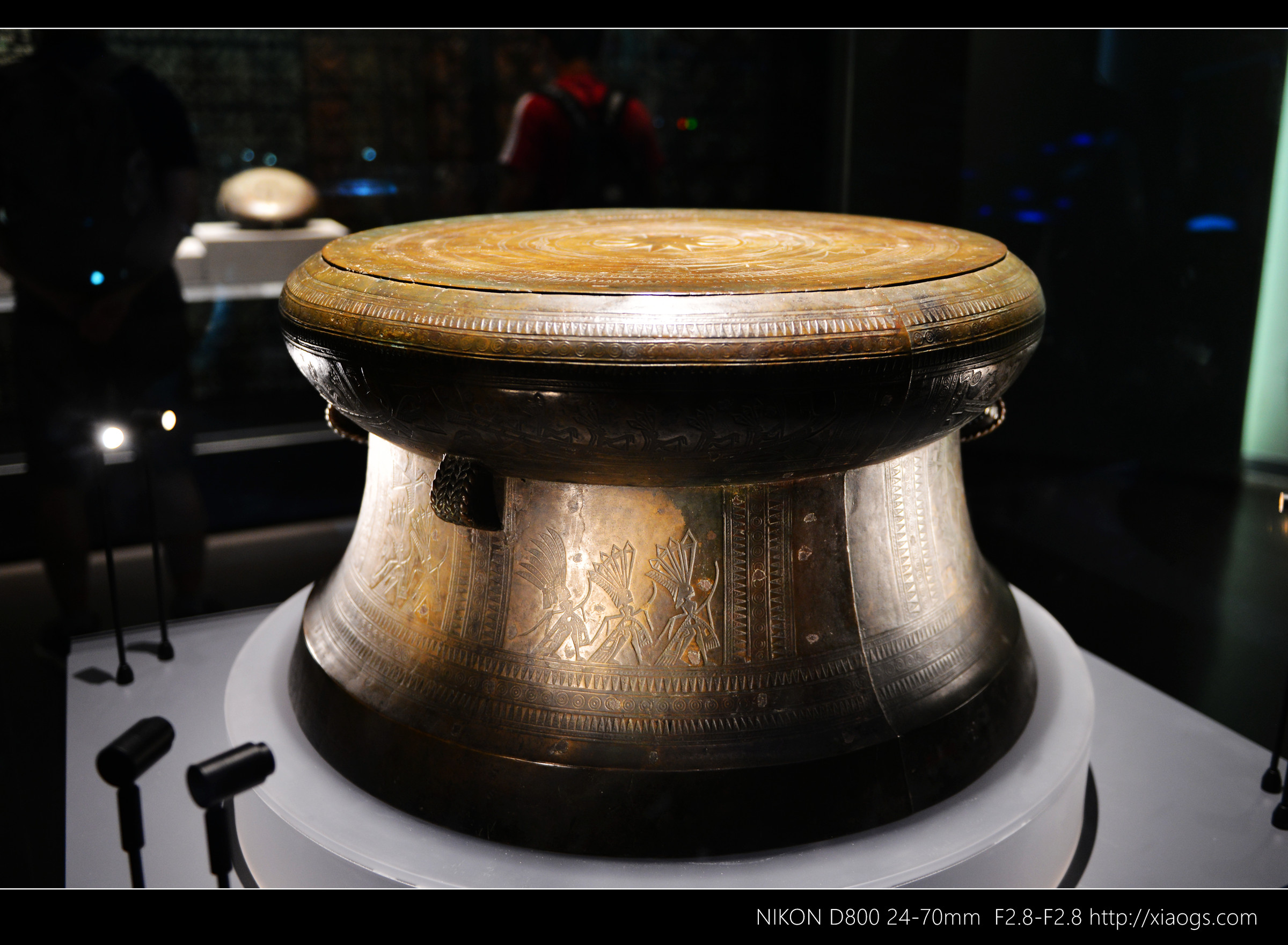 在广西的各个博物馆里,基本都能看到铜鼓,它的表面一般是太阳纹,上有立蛙塑像,在柳州博物馆里见了很多。这件西汉铜鼓,鼓胸上有羽人划船纹,鼓腰是羽人舞蹈纹,头戴羽饰,下系羽裙,双臂展开,作舞蹈状。