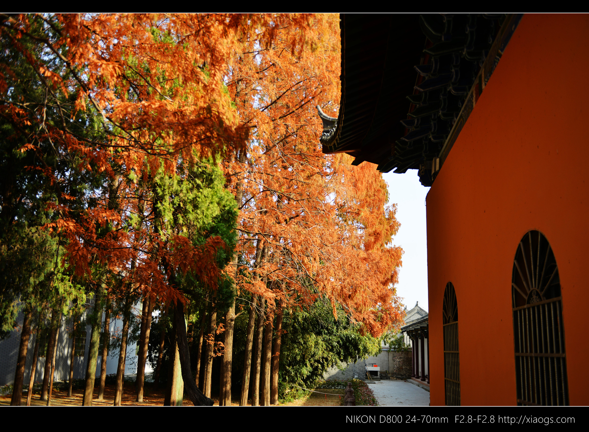 继续前行,是一片广场,前面一座砖质照壁,挂着取谐音的“三生有杏”明晃晃的亮黄色旗子,给人以温暖。照壁另一侧,寺庙内高大、铜红色的落羽杉格外引人注目,现在也是它一年中最美的时节。