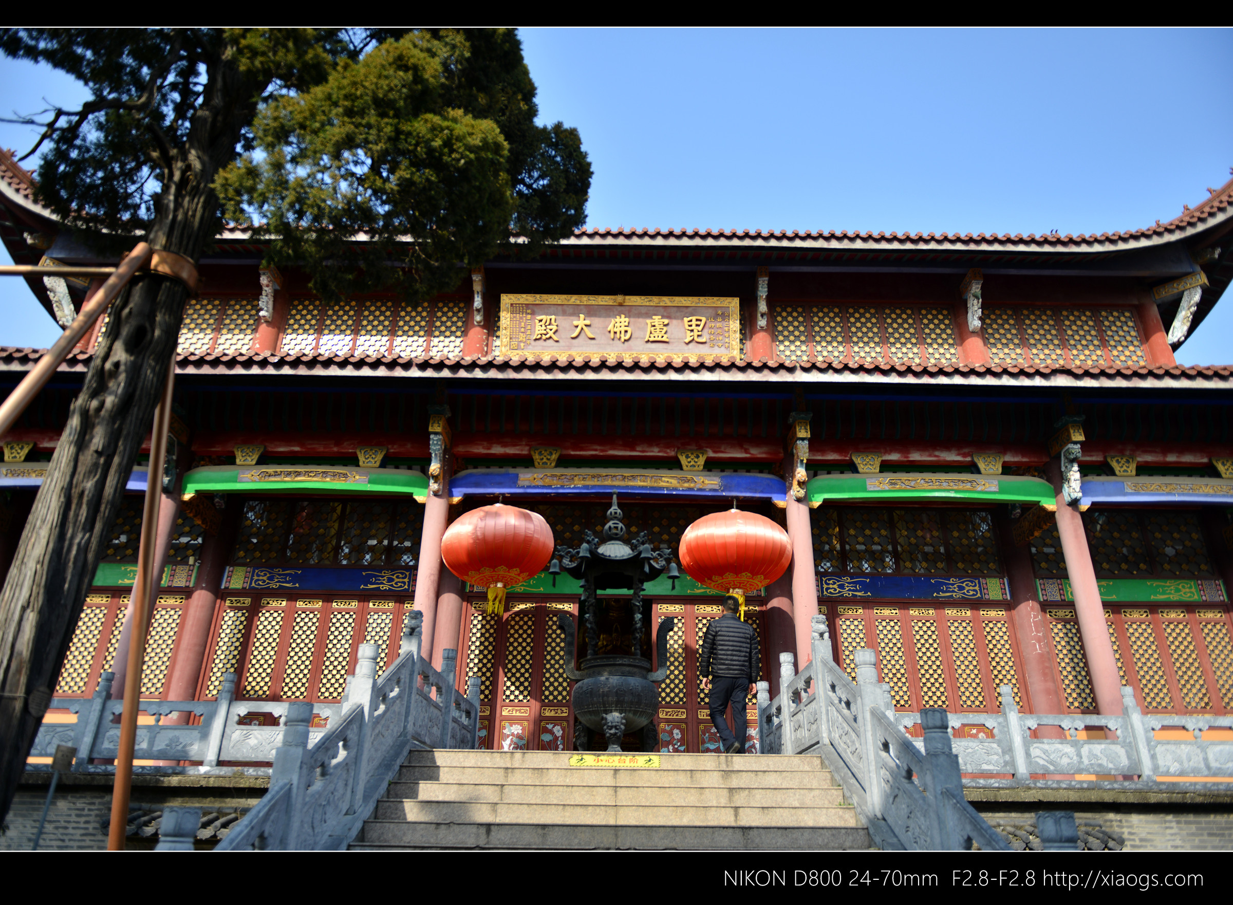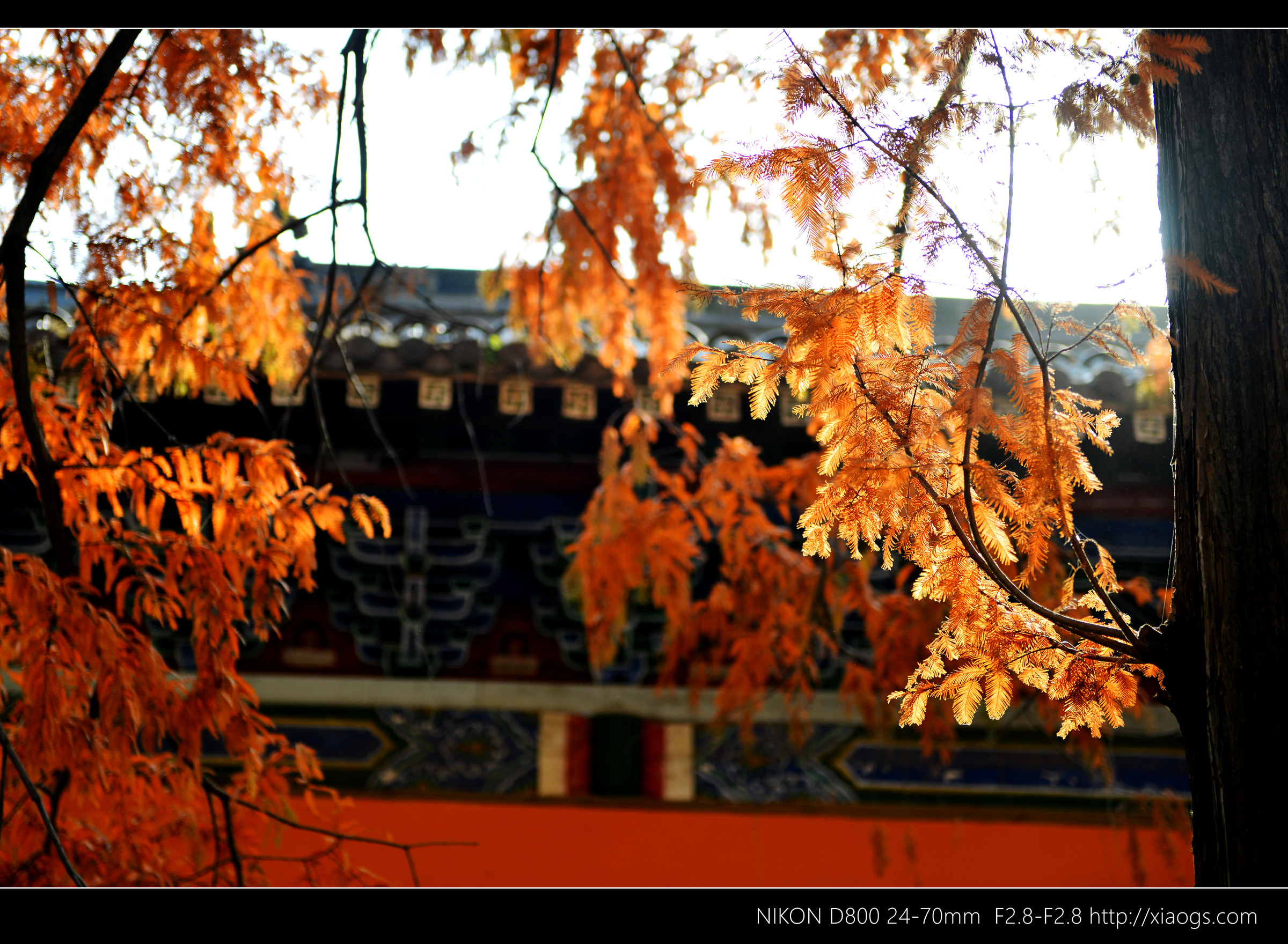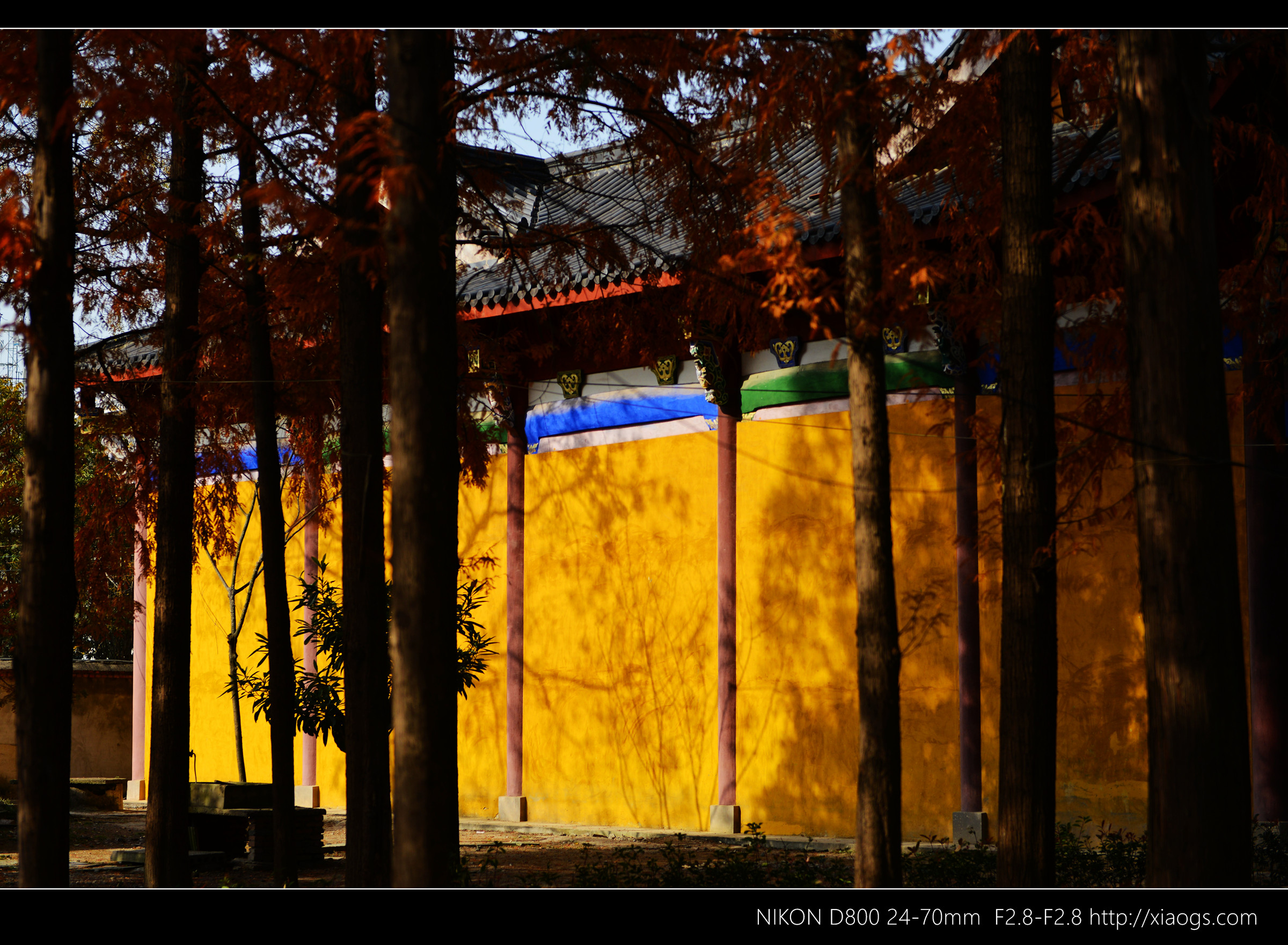 树干下斑驳的光影,映在明亮黄色的寺庙建筑上,给人一种庄严、空幽之感。