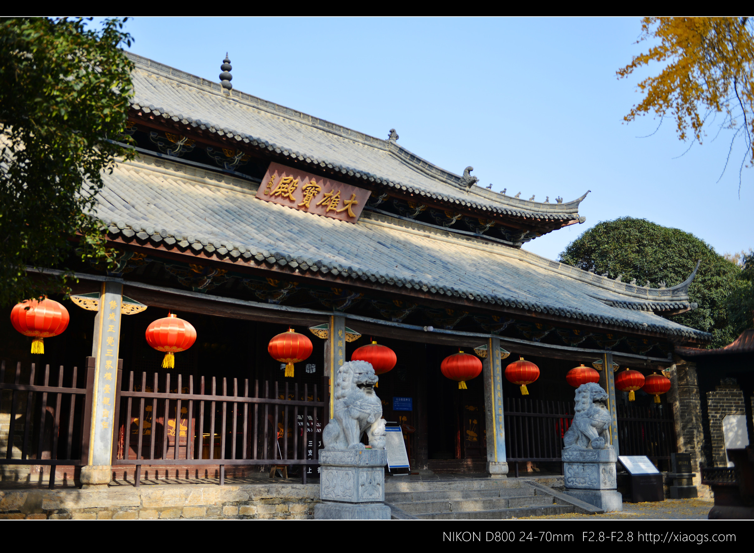 过二佛殿,进入第二进院。正面是寺庙的主体建筑大雄宝殿,现存建筑为乾隆四十一年(公元1776年)重建,重檐歇山顶,面阔五间,进深三间。