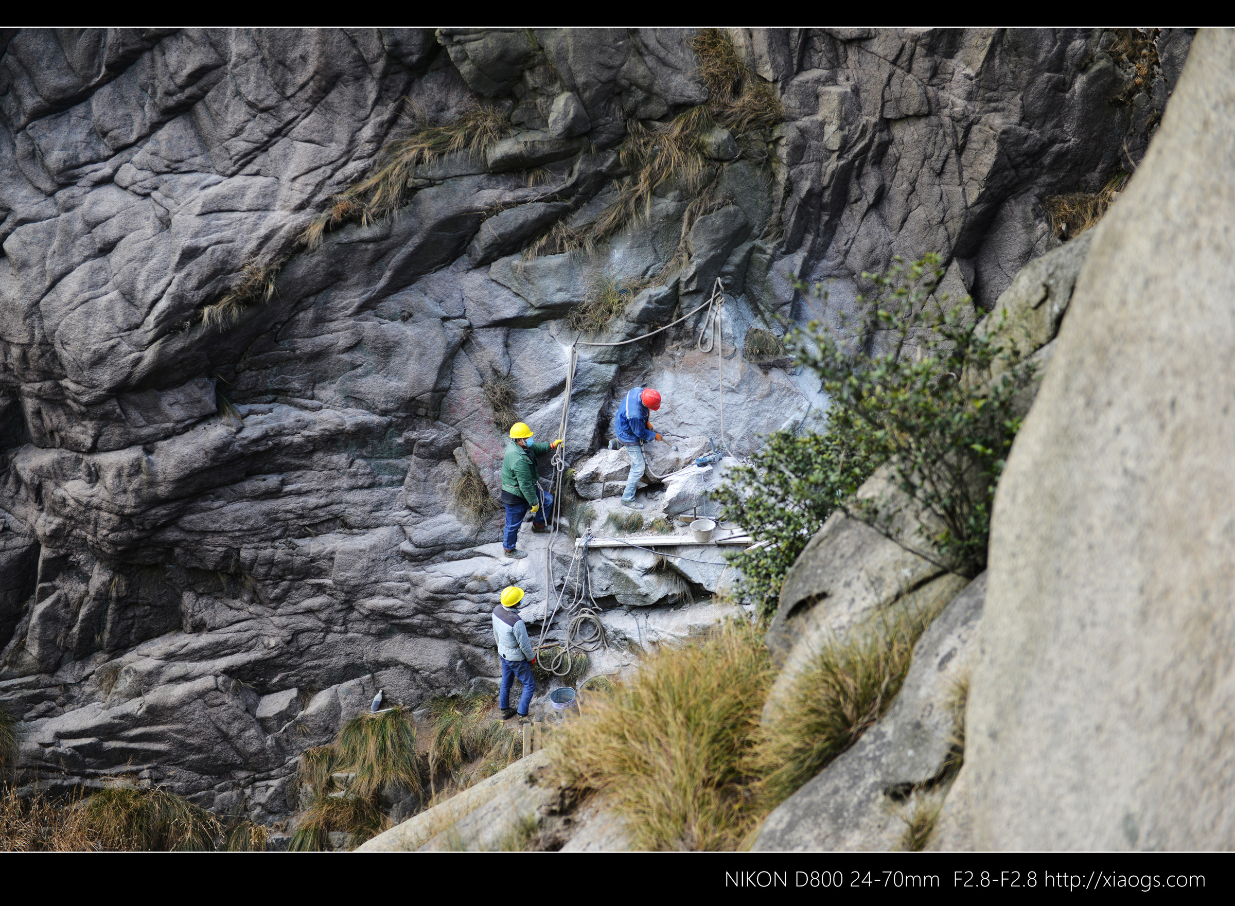 工人师傅正在这里修整,从山上凿石,然后用绳挂桶,装石运下,垒在旁边。