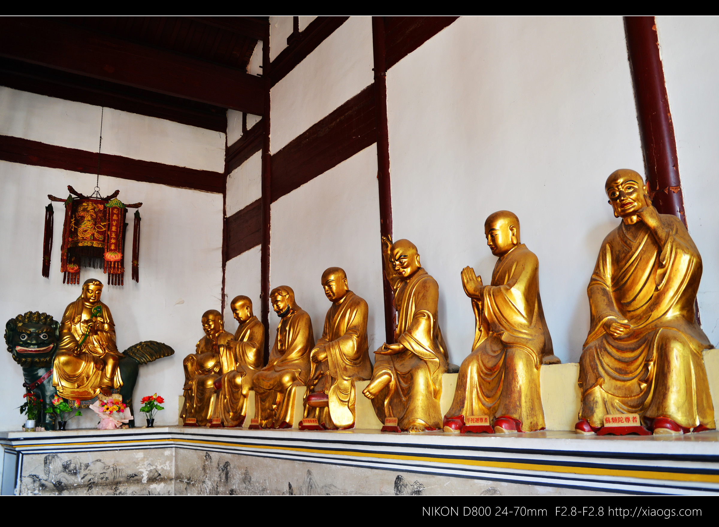 两侧有金色的十八罗汉,以及普贤和文殊菩萨,为清代塑像。