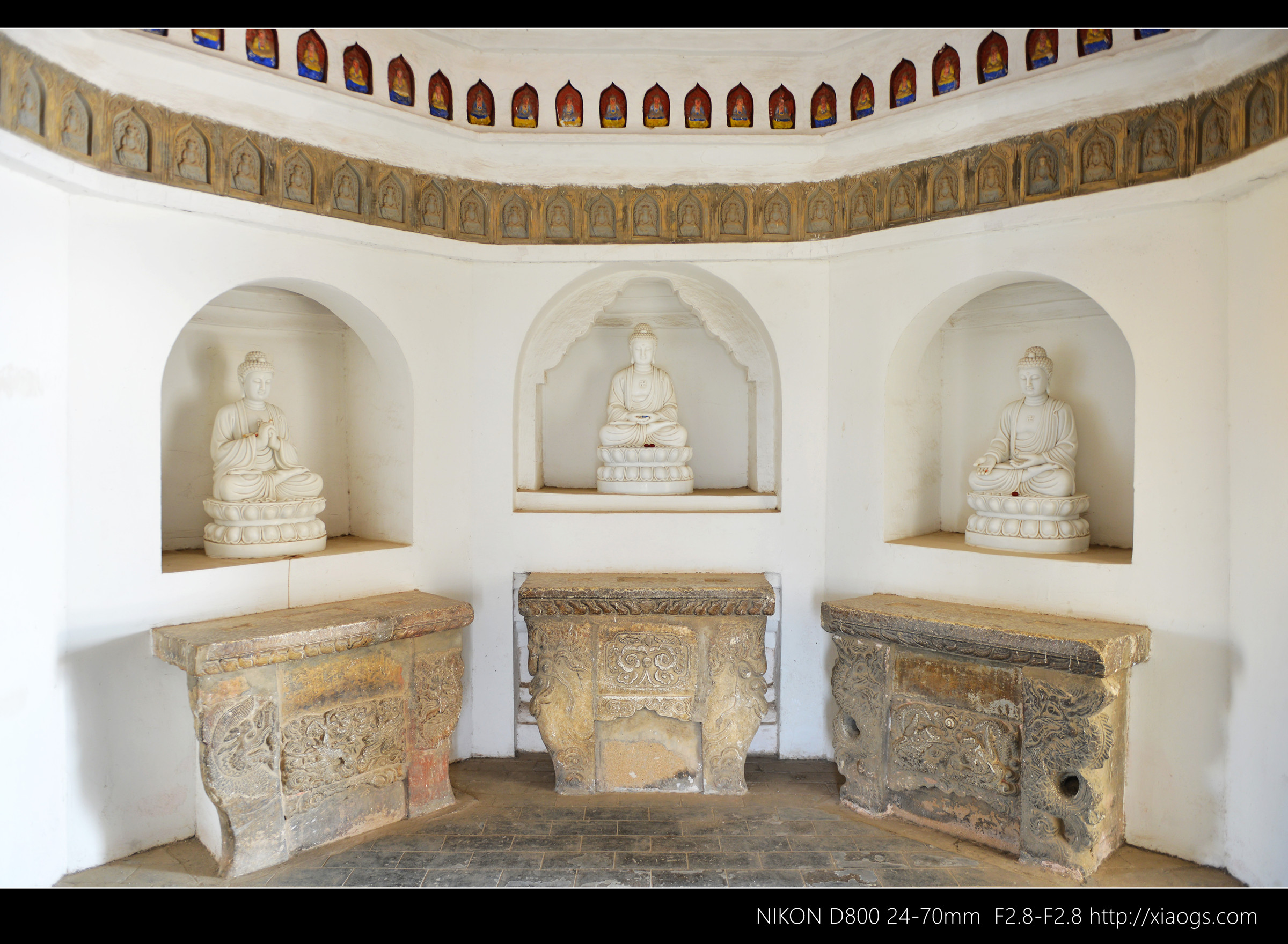 大雄宝殿供奉的是横三世佛,东方琉璃世界药师佛、西方极乐世界阿弥陀佛,还有娑婆世界释迦牟尼佛。