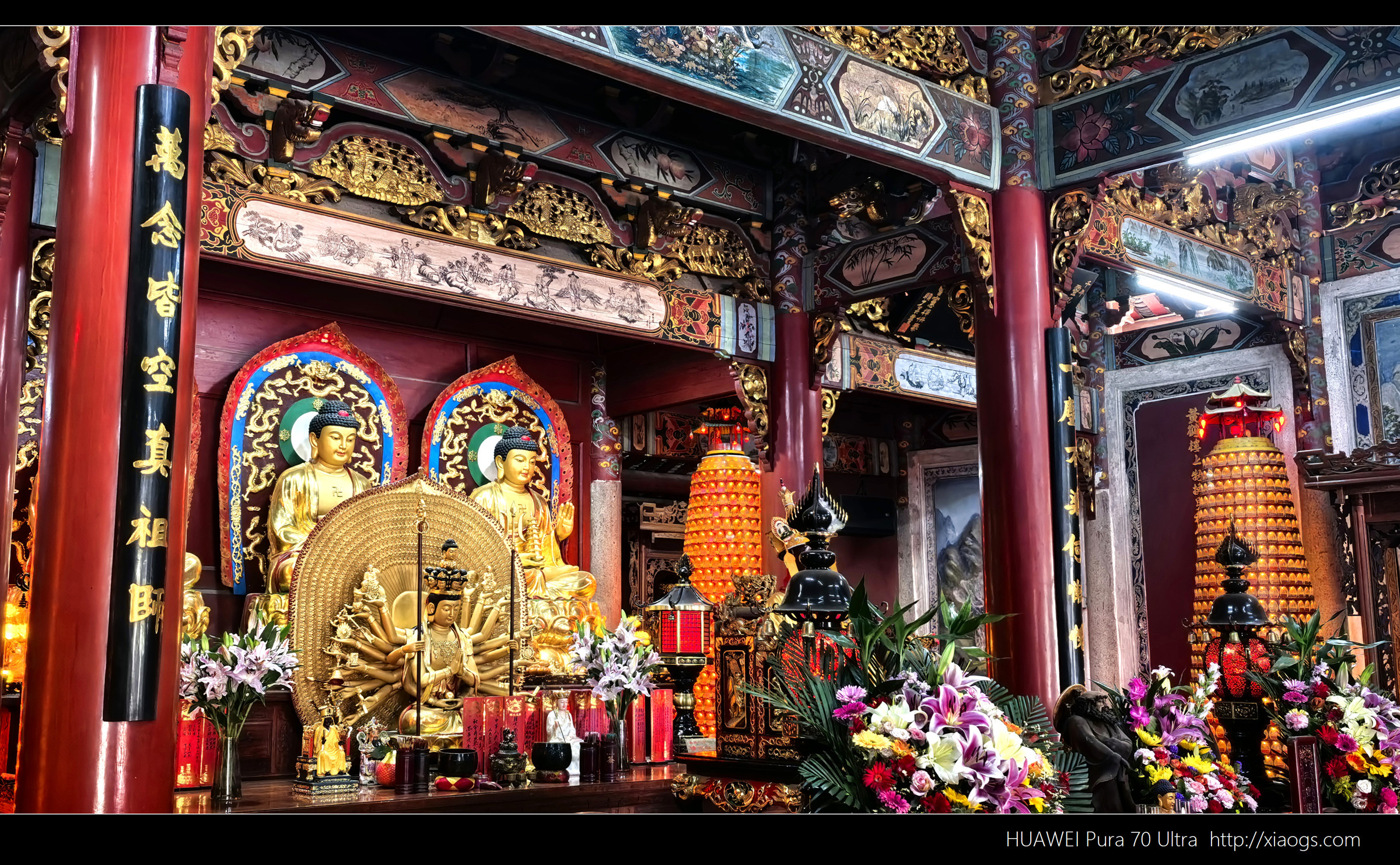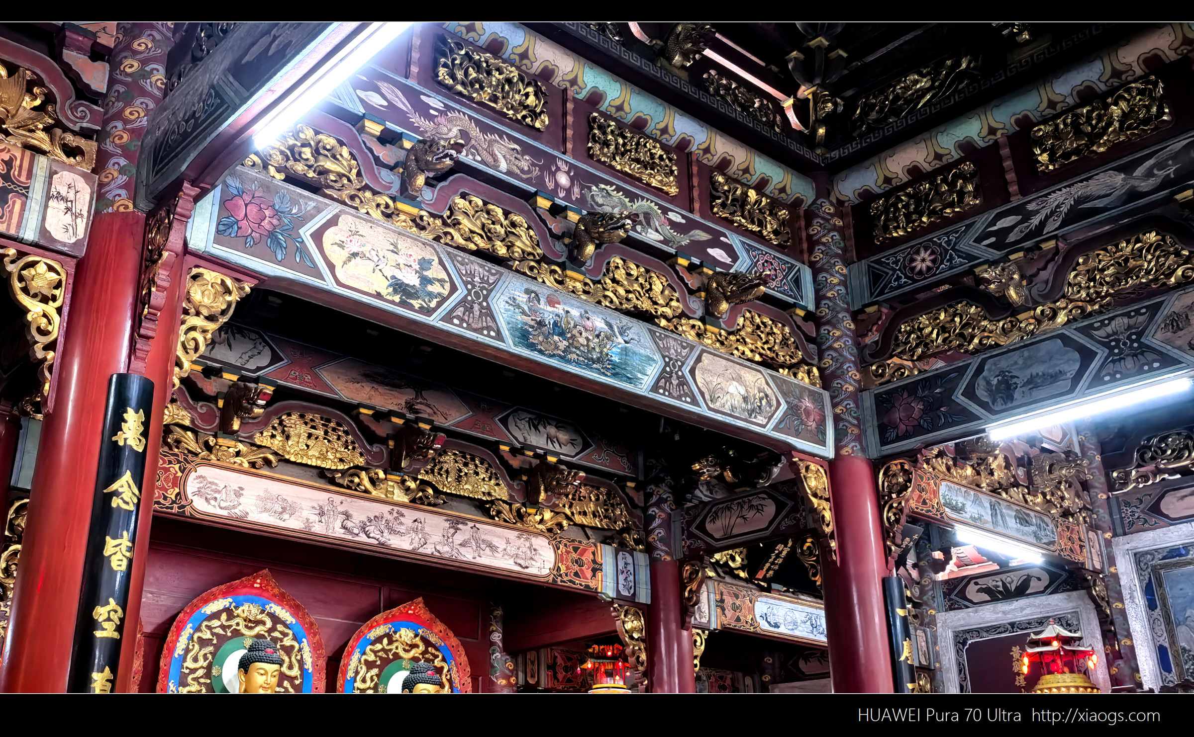 其内供奉三世佛,前面是清代由整根楠木雕成的惭愧祖师像,这个角度正好被遮住。