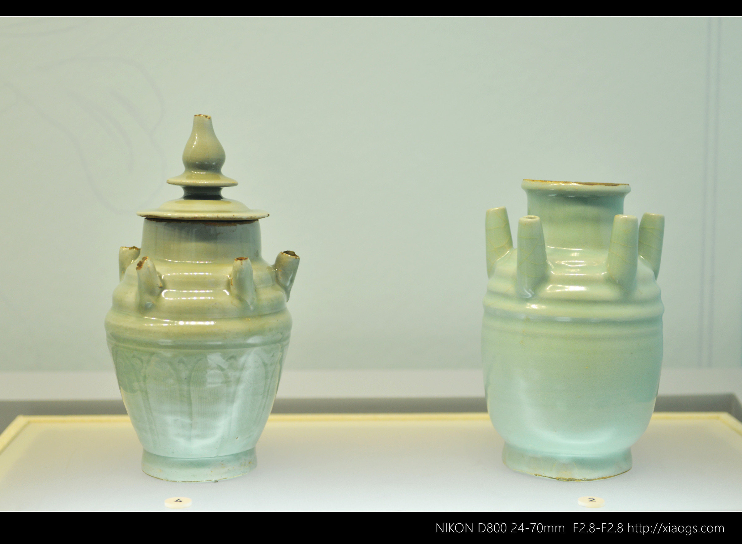 釉之集大成者,是青釉,巅峰是粉青和梅子青。下图左右分别是宋代龙泉窑的青釉和粉青釉五管瓶,对比感受下粉青釉的淡雅玉质感。