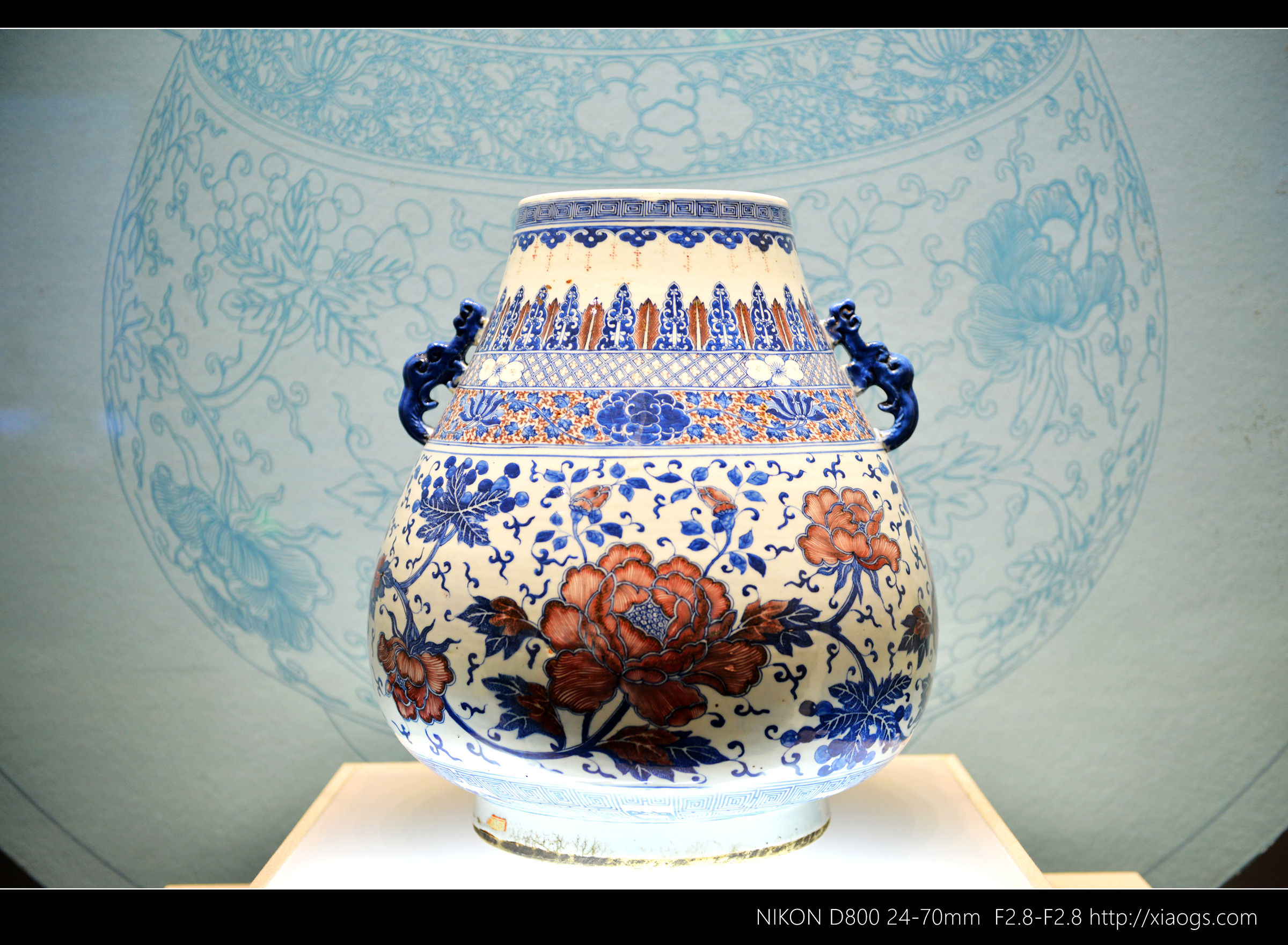 青花瓷的钴料烧制后呈蓝色,故得名。初创于唐,历代不衰,这件是清代青花釉里红缠枝牡丹纹螭耳尊。